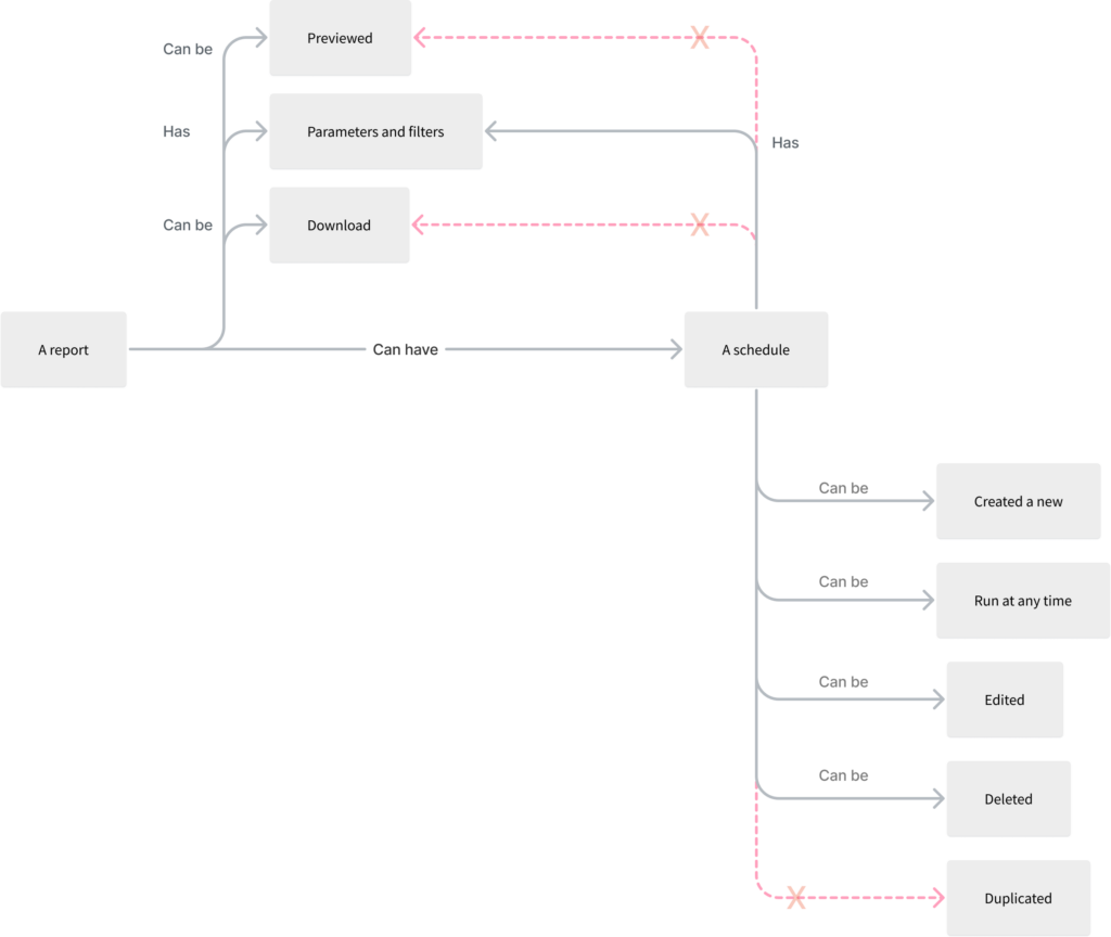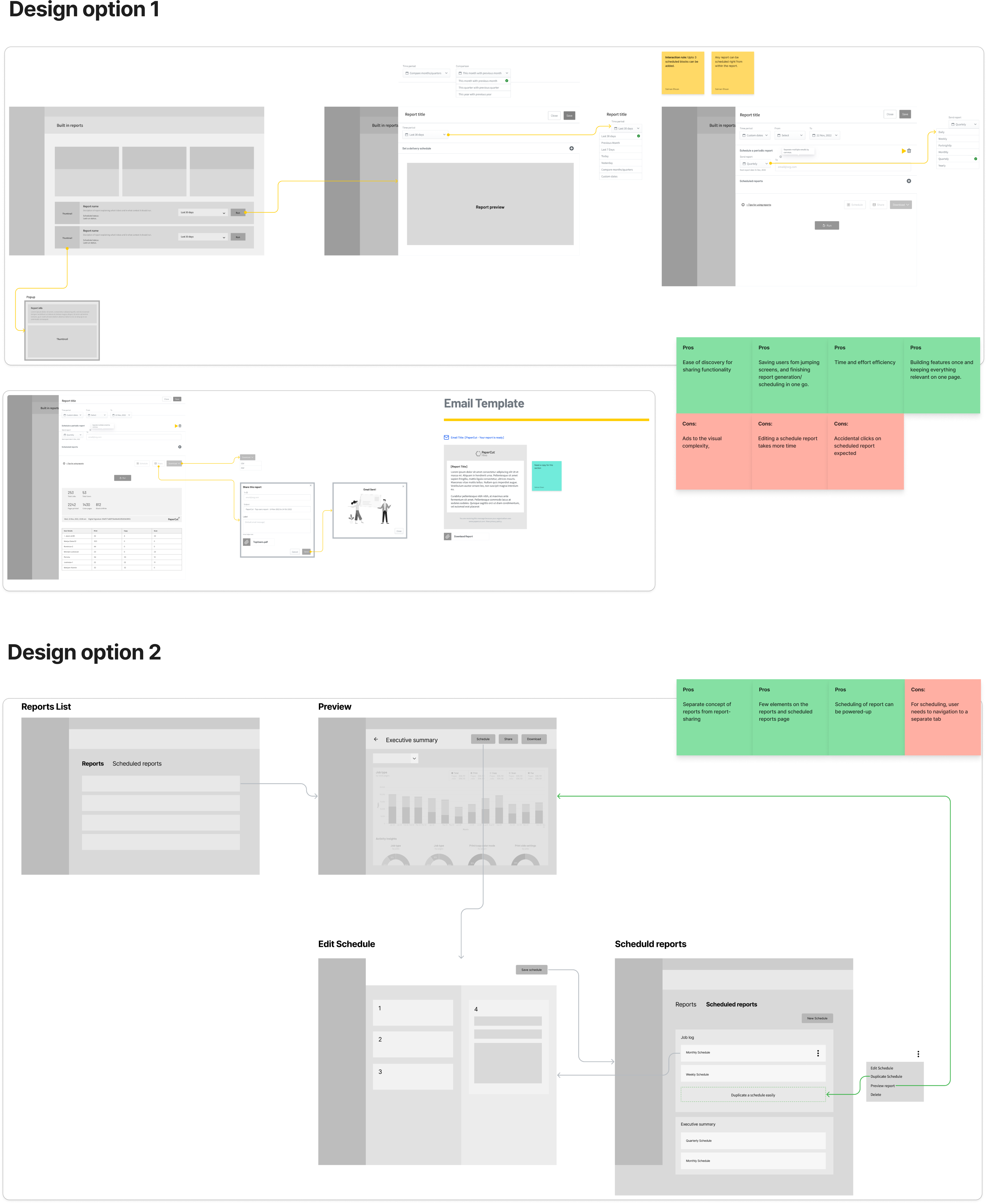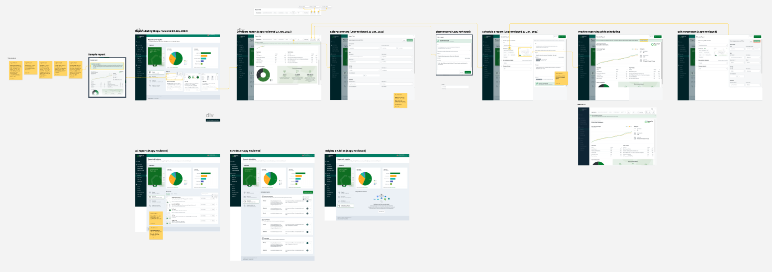 Our initial design mixed scheduled reports with the primary report list, hindering usability. Users could reschedule reports multiple times with varying parameters, creating complexity and visual clutter. This made distinguishing core report functions from scheduling details difficult. In the next iteration, I separated these sections, providing a clearer and more focused experience.