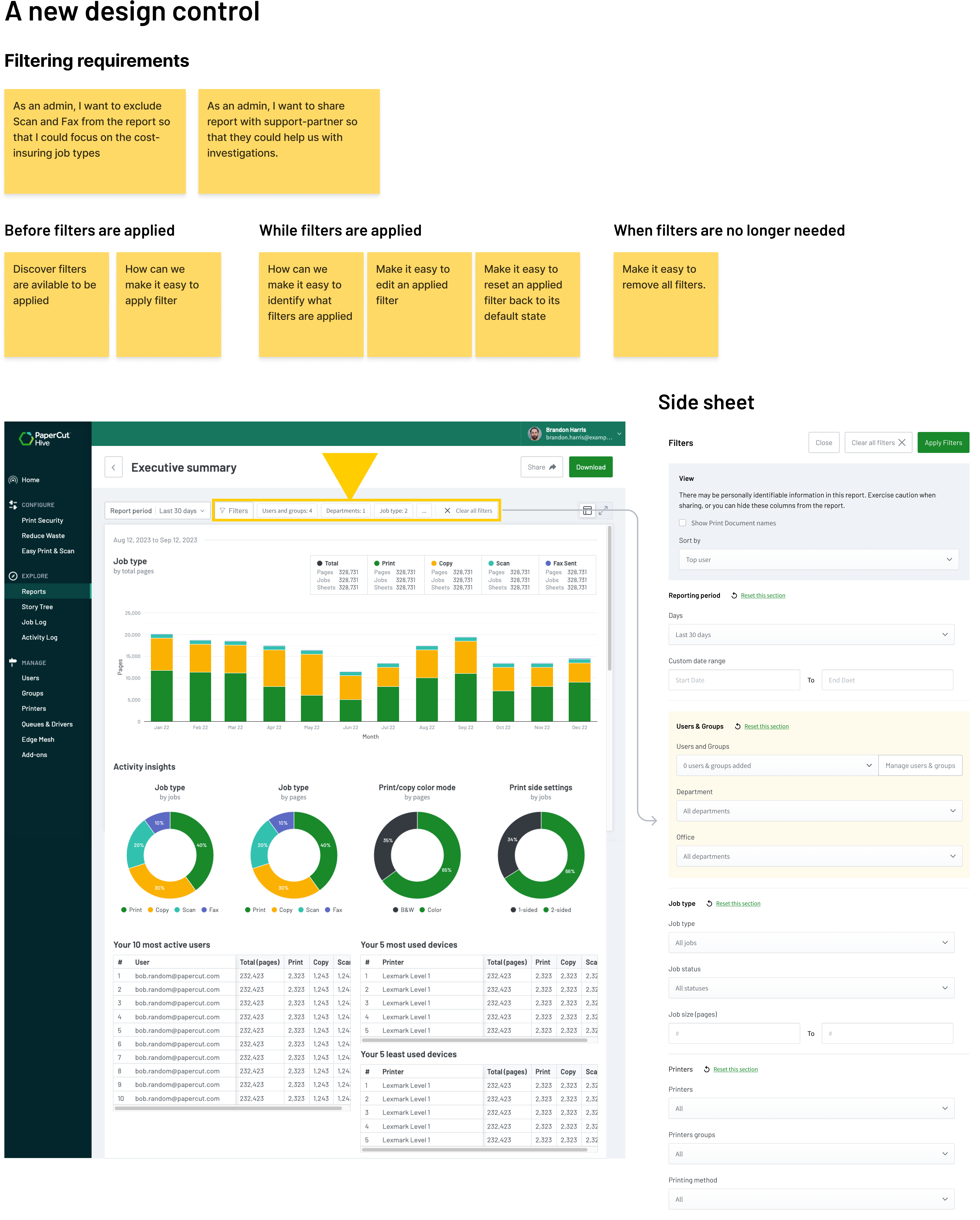 Reports in a print management application provide valuable assistance and confirmation of value to the business by providing comparative insights into cost, waste reduction, and security issues. As the initiative’s design lead, I provided end-to-end help in developing a high-quality reporting and insights tool for consumers.